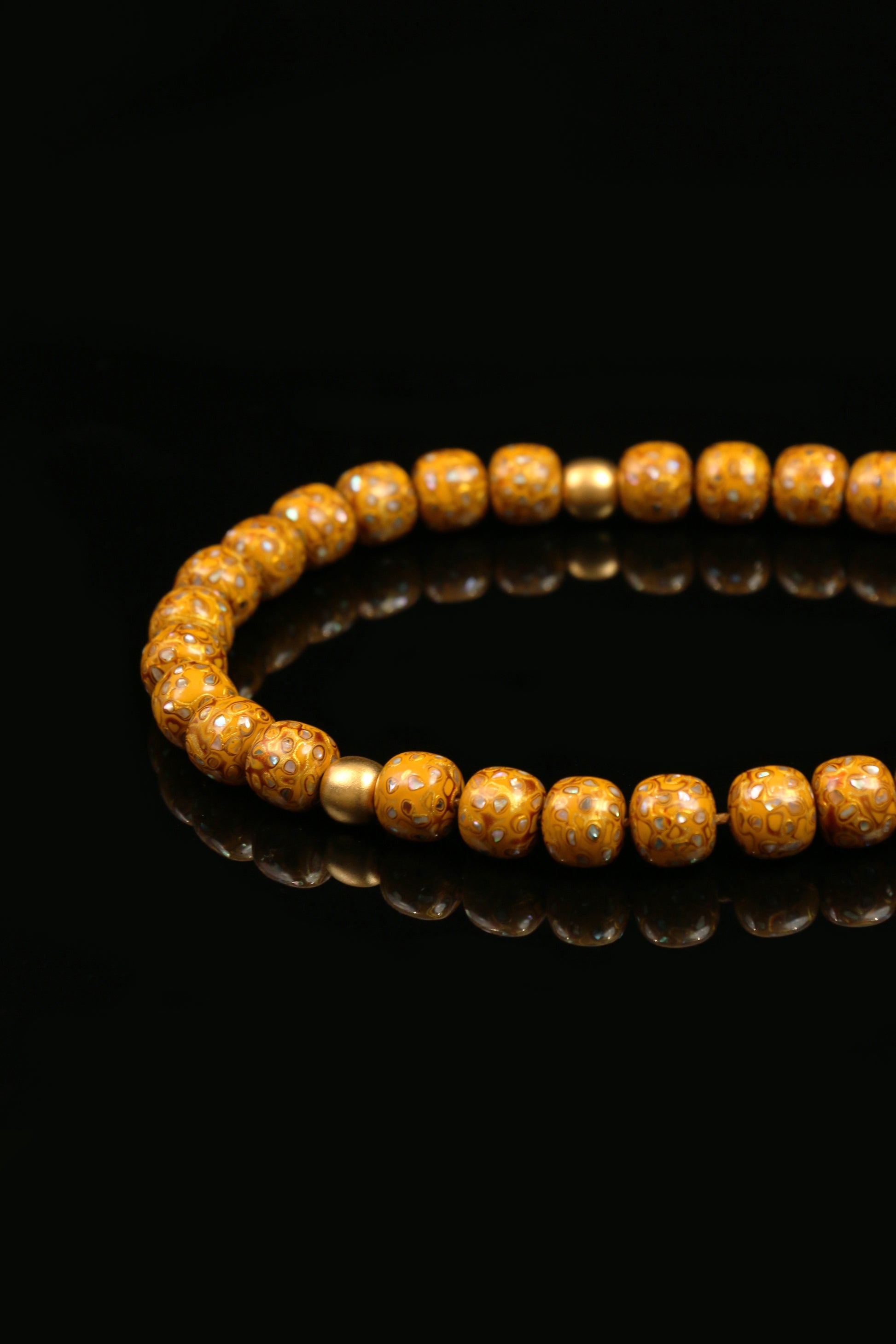 ثلاث وثلاثون خرزة أسطوانية من خشب الزيتان البنفسجي المزينة برقائق الذهب والفضة وصدف اللؤلؤ، تتألق بلمعان ناعم من الطلاء اللكي ذي اللون الذهبي الفاتح. يبلغ حجم كل خرزة 11 × 12 مم، وقد خضعت لطبقات متعددة من الطلاء اللكي، حيث تتوارى لمعة رقائق الذهب والفضة وقطع الصدف برقة داخل الطبقات. بوزن يبلغ 70.0 غرام وطول إجمالي 36 سم، تمنح المسبحة إحساسًا متوازنًا وثابتًا في اليد، بينما يكتمل تصميمها بشرابة خيطية منسوجة بإتقان تضفي لمسة بسيطة وأنيقة.
