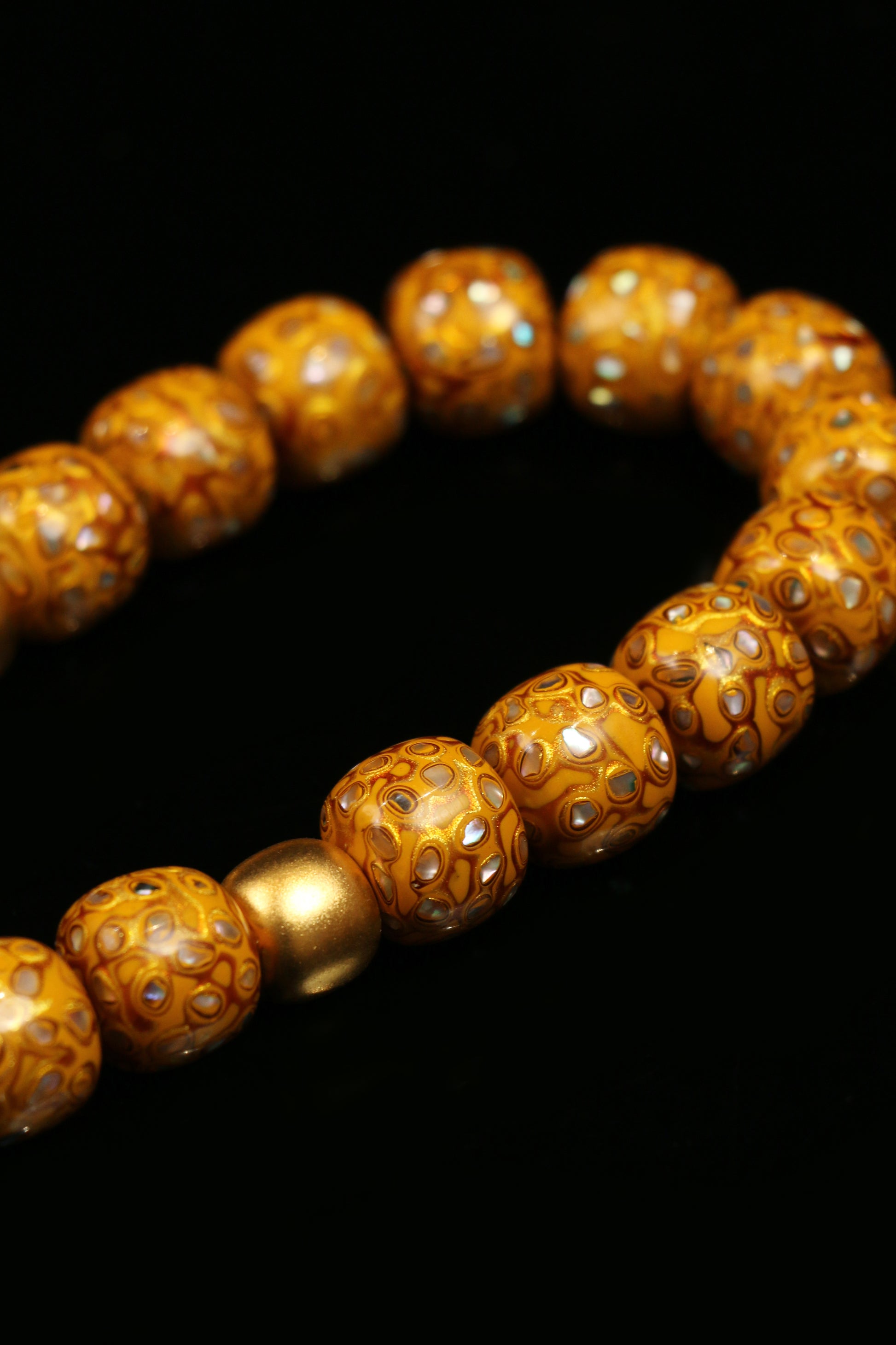 مادة الخرز: خرز من خشب الزيتان البنفسجي مزين برقائق الذهب والفضة وصدف اللؤلؤ