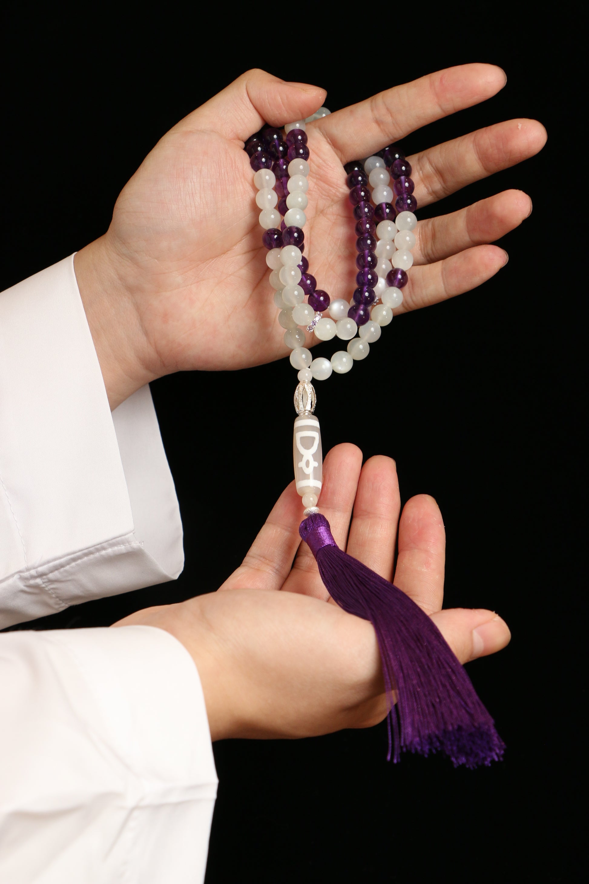Discover the sacred dialogue between self and soul with Meet, where 99 beads of amethyst and moonstone capture the magical convergence of twilight's embrace. The profound wisdom of amethyst merges with moonstone's ethereal glow in perfect harmony, each 8mm sphere becoming a testament to those transformative moments when inner longing meets cosmic answer. Weighing 101.2g with a generous 60cm length, this substantial piece flows through the hands with dignified grace, while the Tibetan bead and fine cord tassel complete this sacred narrative of encounter.