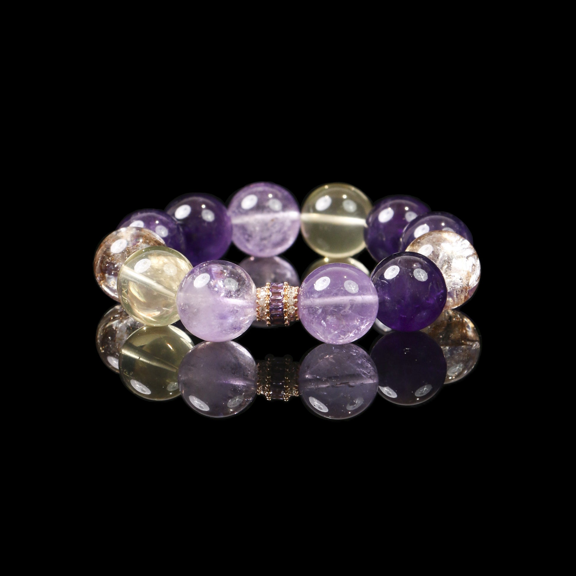 Take the Nextstep in your journey of elegance with our magnificent bracelet, where 12 substantial beads of Uruguayan amethyst, lavender amethyst, ferruginous quartz, and citrine create a stunning representation of progressive beauty. Each 17mm sphere guides you through a spectrum of sophisticated hues - from the deep wisdom of Uruguayan amethyst to the gentle grace of lavender amethyst, accented by the golden promises of ferruginous quartz and the sunny optimism of citrine. Weighing 82.4g with an 18cm circumference, this piece marks a significant step forward in both style and substance, transforming every wear into a celebration of personal evolution.